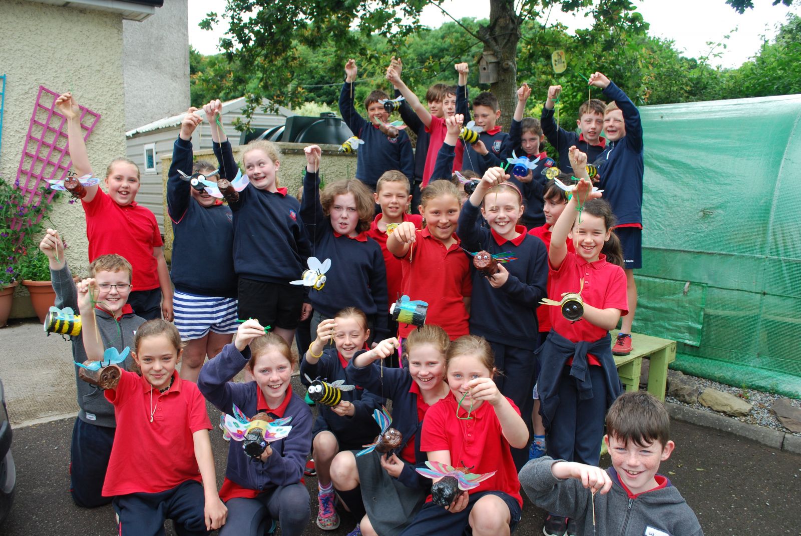 Conna National School opened its multi-award winning garden in June 2017 to a huge crowd of garden enthusiasts including family and friends of staff and pupils; and members of the local Tidy Towns Committee and Conna District Flower Club. The garden looked splendid with lots of colour in the window boxes, raised beds and hanging baskets. Brightly painted raised beds were packed with vegetables and fruit all grown from seed and attended to by pupils. Planning began early in the first term with the help of parents, staff, pupils and Parents Association. The garden’s BIO-DIVERSITY theme was especially suited to bees, butterflies and insects, with a Bug Motel and Bug Dome for flying creatures to nest in! An outstanding array of up-cycled art work included scarecrows, bee and butterfly mobiles and attractive stone creatures. Cork County Council and Muintir na Tíre awarded the school a prize in the OVERALL CATEGORY (Highly Commended), presented in Cork County Hall by Lord Mayor, Cllr. Séamus McGrath . Conna School Garden was awarded Overall Winners in 2016 in UP-CYCLING, ART and COLOUR categories, and Runner- Up in 2015 in the SMALL GARDEN category.