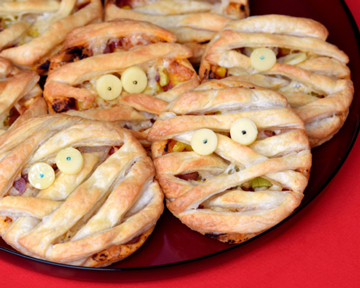 - Cut the leftover pastry into strips and drape over the toppings to create mummy like patterns, pushing the edges down so that they stick to the pastry circles. Tidy up the edges by cutting off the excess with the same circle cutter you used to cut out the original circles.